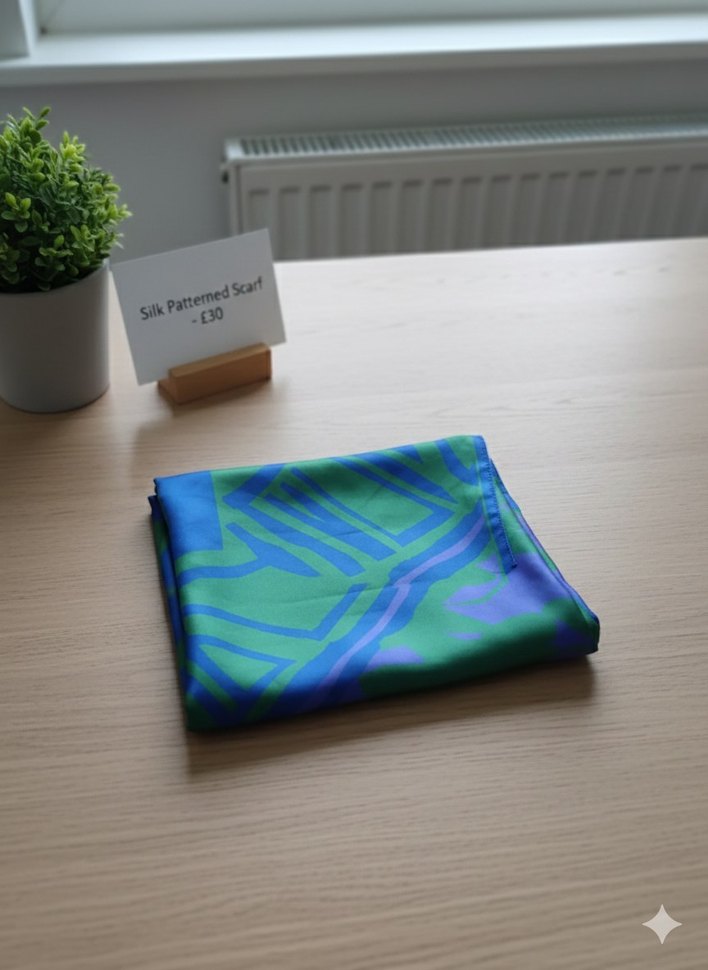 Parlak mavi sentetik kumaştan, minimalist desenli ve drapeli kadın fular, çağdaş ve şık bir tarz sunar.