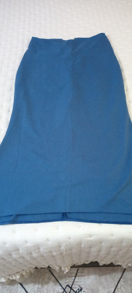 Parlak mavi sentetik kumaştan, drapeli ve midi uzunlukta, sade ve minimalist tarzda, vücuda oturan hamile eteği.