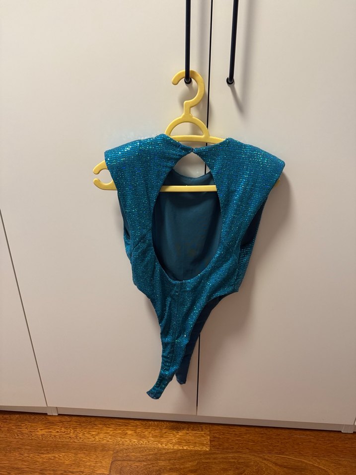 Parlak mavi, baskılı kumaştan, drapeli tasarıma sahip, kısa kesim ve kolsuz, vücuda oturan kadın mayo. Parti ve sokak modasına uygun.