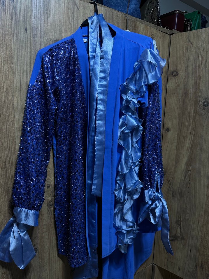 Parlak mavi kumaş, drapeli uzun kesim, yakası kesik ve uzun kollu bu smokin, avant-garde ve street wear tarzını birleştirir. Ön ve manşetlerde fırfırlı detaylar bulunur. Özel dikim Kalıbı rahat 38/42 beden rahat kullanır şalıyla beraber göndereceğim