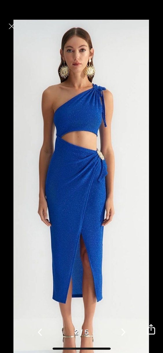 Parlak mavi kumaştan, drapeli ve uzun, straplez, vücuda oturan abiye bir kez giydim S / m ye olur kırışma yapmıyor kumaşı çok esnek ve rahat fermuar yok dekoltesi yerinde