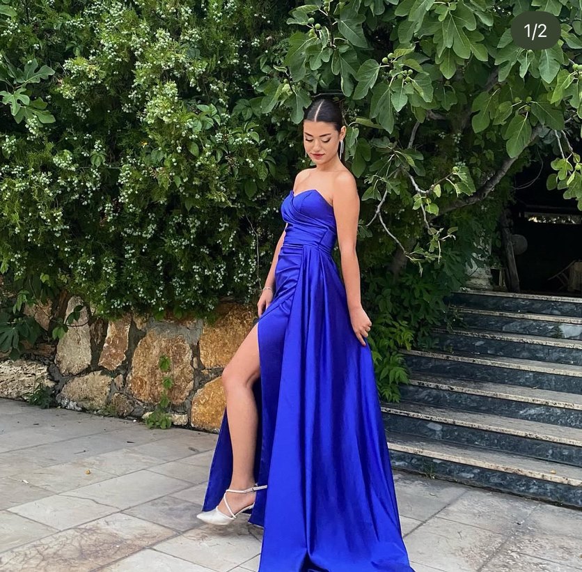 Parlak mavi kumaştan, drapeli ve straplez, uzun ve vücuda oturan abiye elbise. Düğünler için uygundur 1-2 kere giyildi kolları da var ama ben tercih etmemiştim son görselde arkadasım giydi