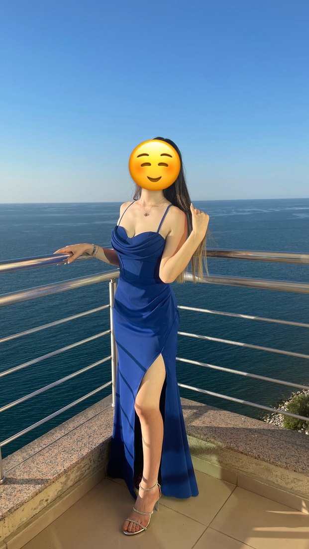 Parlak mavi renkte, drapeli ve straplez uzun abiye elbise. İnce askılı, vücuda oturan kesimi ve yırtmaç detaylarıyla dikkat çekiyor. ✨
