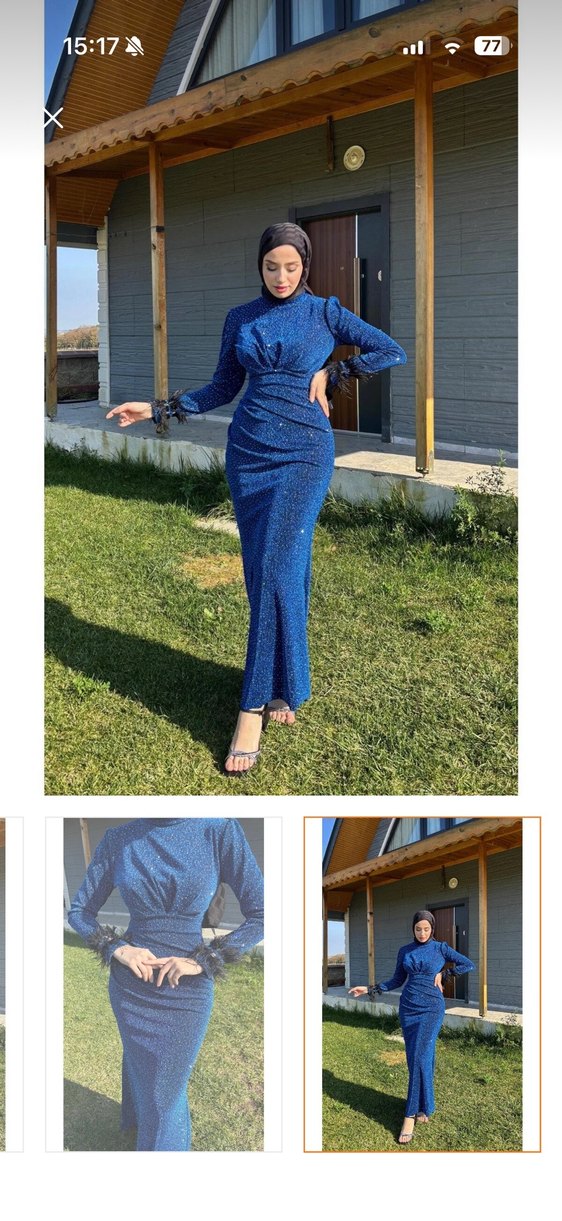 Parlak mavi, drapeli ve uzun kollu, v yaka kesim uzun abiye elbise. İnce oturan modeli ve hafif batik desenli kumaşıyla dış mekan için uygun, gösterişli bir tasarım. ✨
