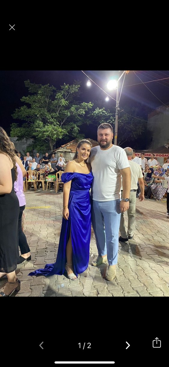 Parlak mavi kumaştan, drapeli ve uzun boy straplez abiye elbise. Kısa kollu, regular fit ve sokak modası tarzında şık bir tasarım. ✨