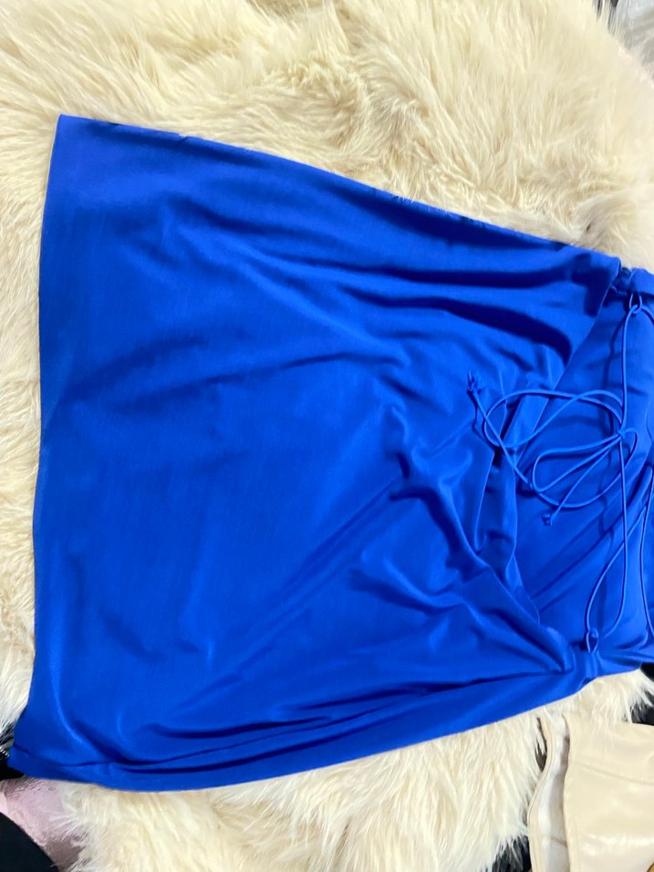 Parlak mavi sentetik kumaştan, drapeli tasarıma sahip, uzun ve vücuda oturan hamile eteği. Outdoor ve athleisure tarzına uygun.