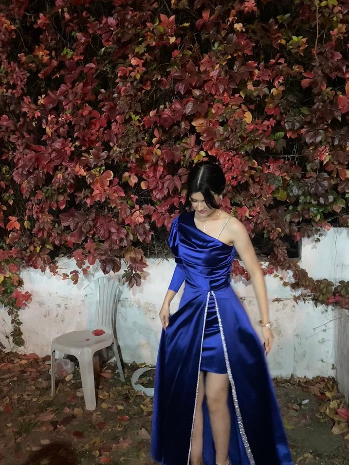 Bu dar kesim, askılı kadın abiye parlak mavi drapeli kumaş ve etnik desenlere sahiptir. Bohem tarzda, şık düğünler için uygundur. sadece 2 defa giyildi