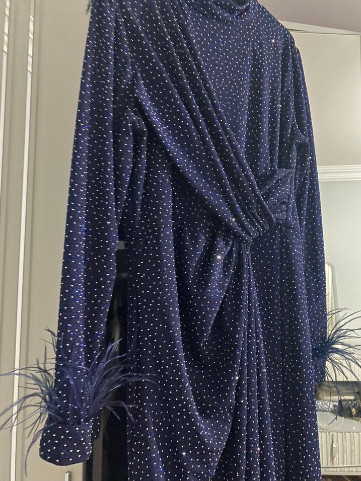 Parlak mavi kumaştan, uzun kollu ve yüksek yakalı, drapeli tasarıma sahip bol kesim abiye elbise. Kollarda tüy detayları bulunur. ✨