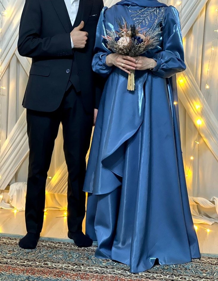 Parlak mavi renkte, drapeli uzun kollu, notched lapel yakalı ve baskılı detaylara sahip modern klasik tarzda nişan elbisesi.