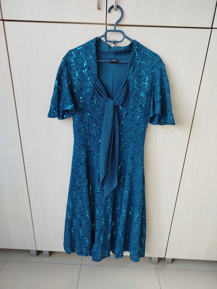 Parlak mavi tonlarda, kısa kollu ve drapeli V yakalı, vücuda oturan midi abiye elbisedir. Parti için uygundur.