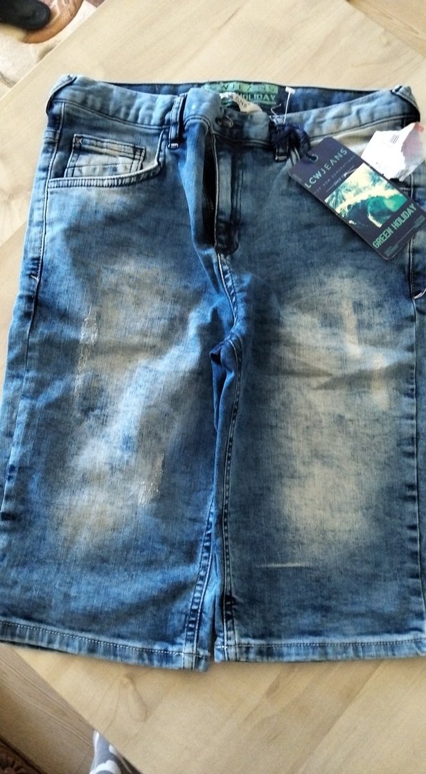 Parlak mavi renkte, düğmeli ve bol kesim erkek denim şort. Rahat ve desen içermeyen sokak tarzı için uygundur.