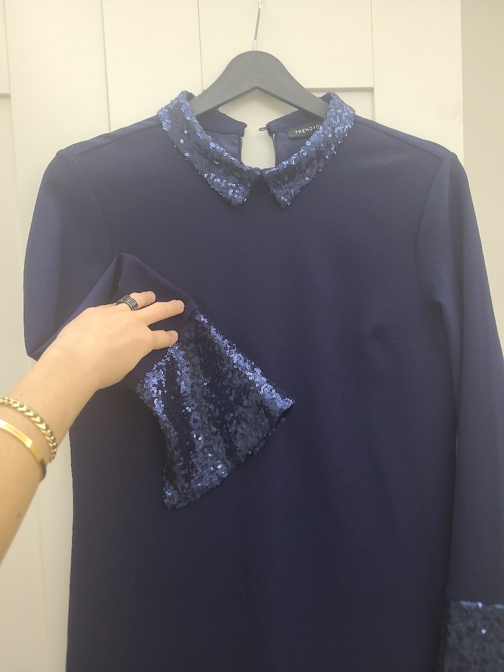 Dar kesim, midi boy elbise, parlak detaylı yakası ve düğmeli uzun kolludur, romantik akşamlar için uygundur.