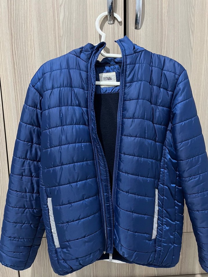 Parlak mavi renkte, fermuarlı ve yakası notalı erkek çocuk montu. İç kısmı yumuşak ve sıcak tutan kumaştan, günlük rahat stil için uygun.