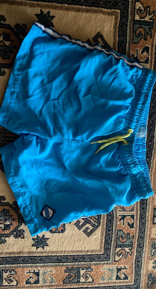 Parlak mavi renkli, elastik bel bantlı ve sarı bağcıklı erkek çocuk şort mayo. Küçük bir logo detayı bulunur.