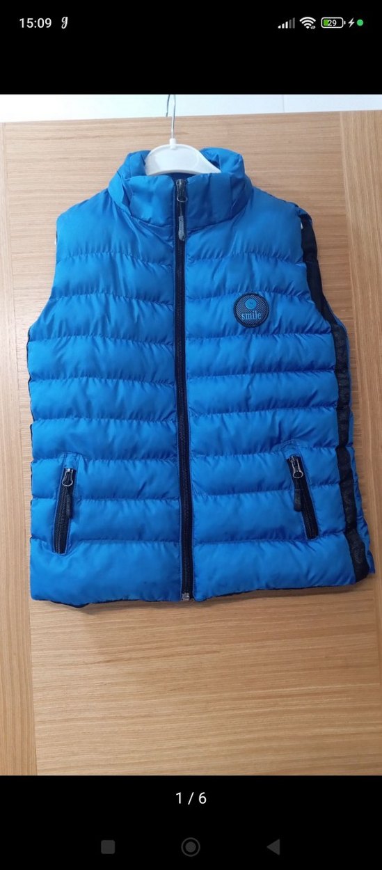 Parlak mavi renkte, fermuarlı cepli ve kesik yaka detaylı, erkek çocuklar için slim fit yelek. Kolsuz ve trend sokak stili için uygundur.