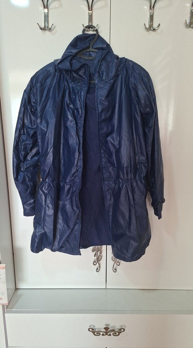 Parlak mavi sentetik kumaştan, bol kesim ve pileli tasarımlı erkek midi yağmurluk. Notlu yaka ve bant detaylı kollar içerir, dış mekan için uygundur. ️