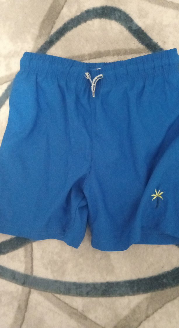 Parlak mavi renkte, bol kesim ve mini boy erkek mayo. Sahil için uygun, sade ve streetwear tarzında. 5 6 yas