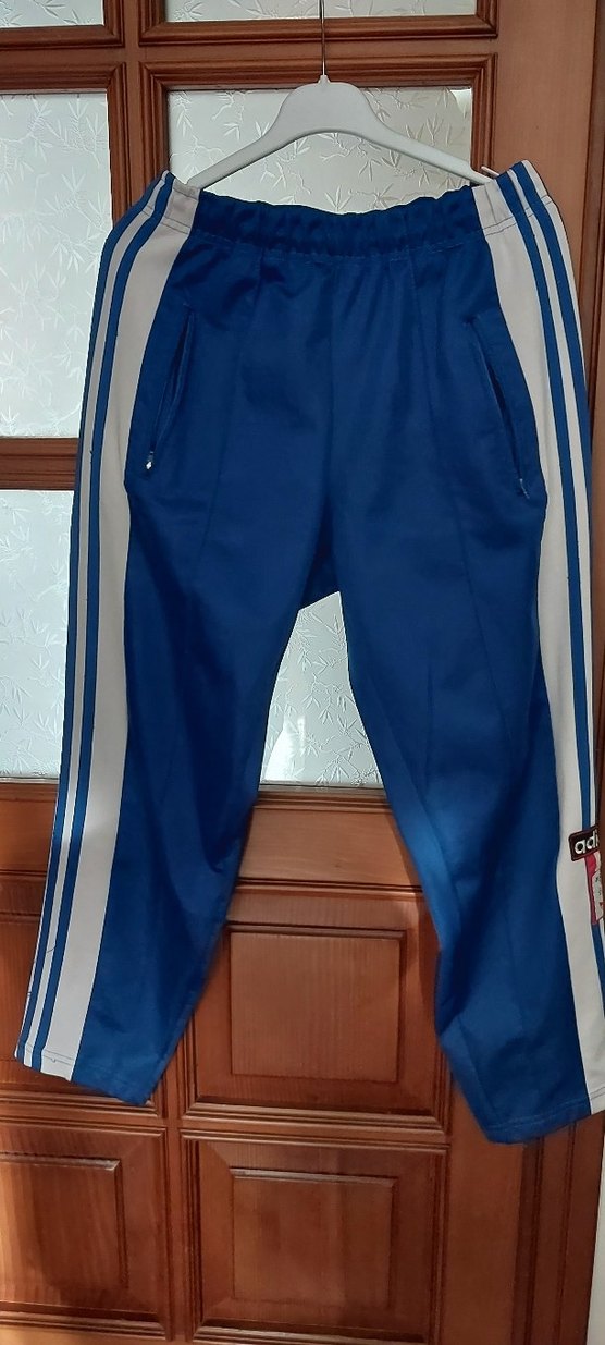 Parlak mavi sentetik kumaştan, fermuarlı cepli, yan çizgili ve dar kesim erkek eşofman altı.