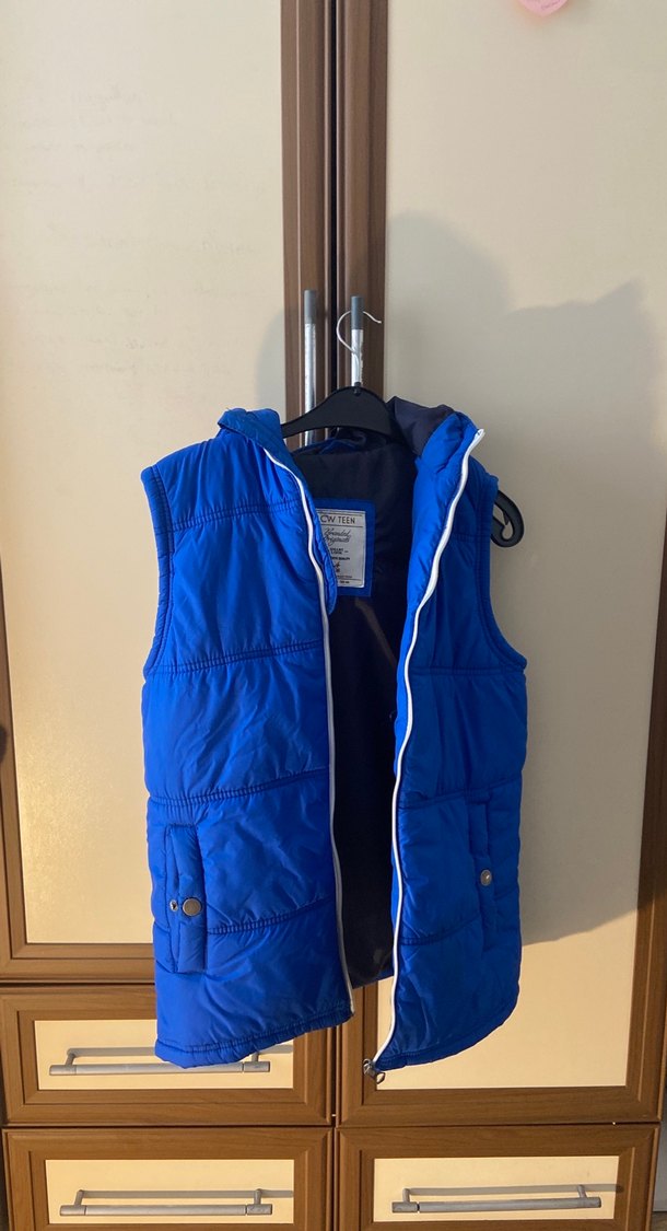 Parlak mavi renkli, yüksek yakalı, fermuarlı ve cepli erkek yeleği. Yumuşak ve sıcak kumaştan, dar kesim ve kolsuz tasarım.