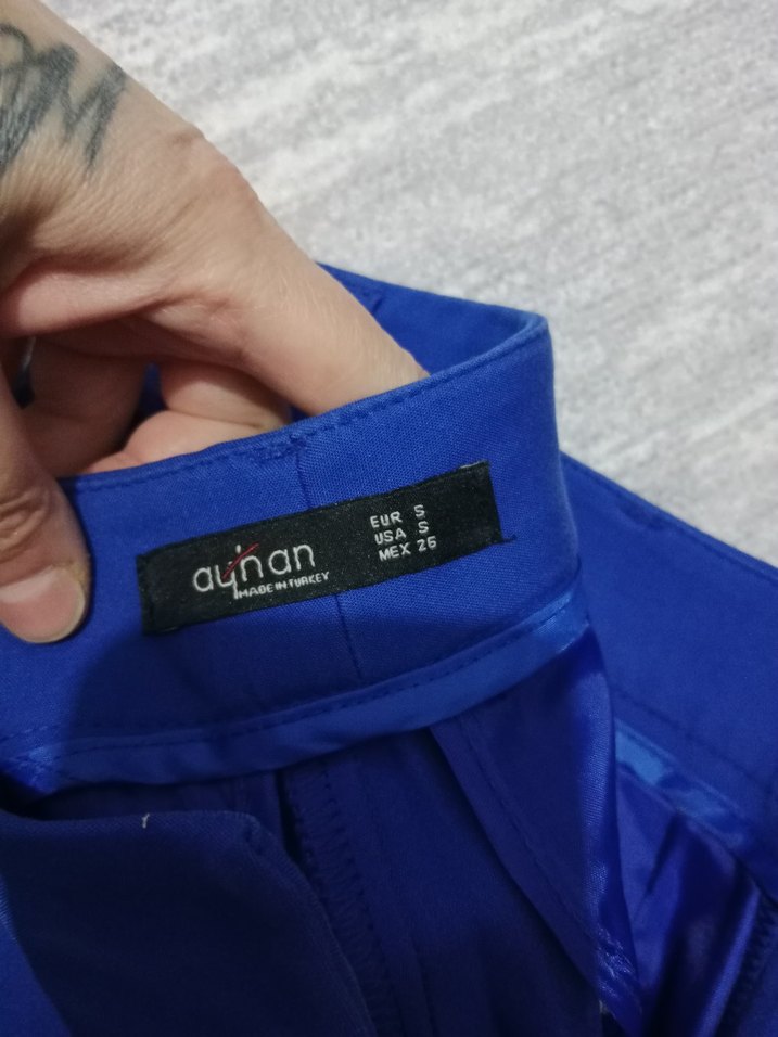 Parlak mavi, fermuarlı, baskılı desenli kadın kumaş pantolon. Midi boy ve sentetik kumaştan, Aynan markasına ait. Sokak modası ve athleisure tarzına uygun. ✨