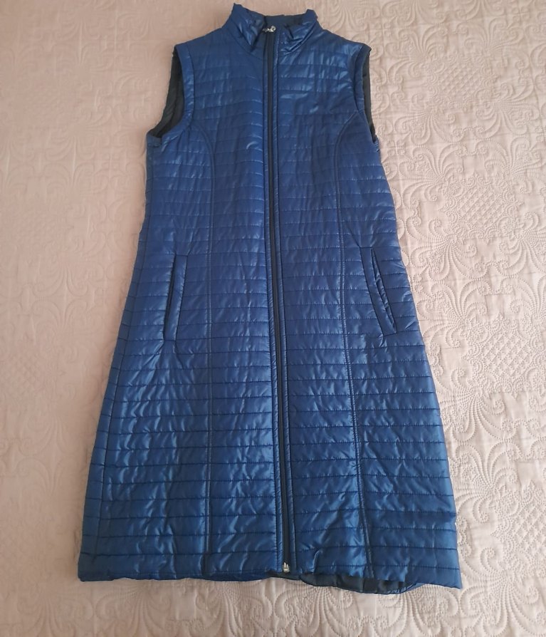Parlak mavi renkte, fermuarlı ve kolsuz kadın yeleği. Fitted kesimi ve midi boyu ile günlük sokak stiline uygundur.
