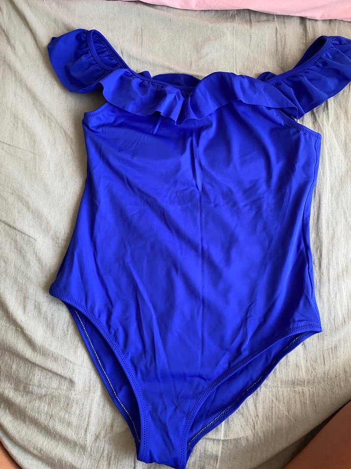 Parlak mavi, fırfırlı ve kolsuz tasarıma sahip, vücuda oturan bu mayo, bohem tarzıyla plaj için uygundur. Göğüs pedi var. Bedeni hatırlamıyorum M-L uygundur