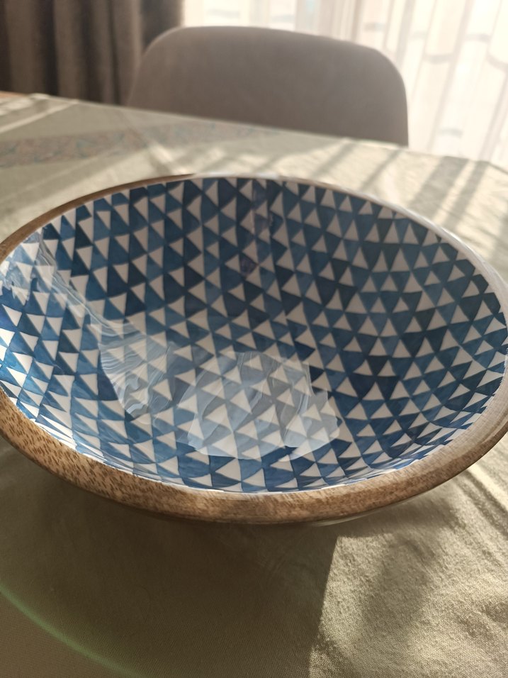 Parlak mavi tonlarda soyut geometrik desenli, doğal ahşap kenarlıklı bohem tarzda tabak. Sofranıza özgünlük katar. ️
