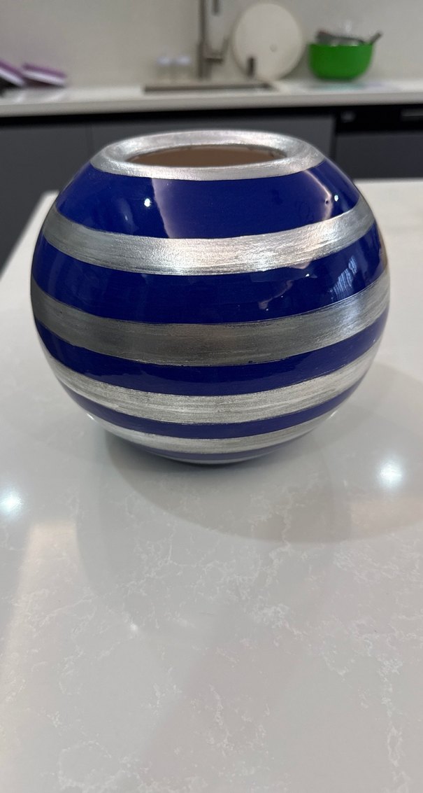 Parlak mavi renkli, gümüş yatay çizgilerle süslenmiş yuvarlak şekilli ve pürüzsüz yüzeyli vazo.