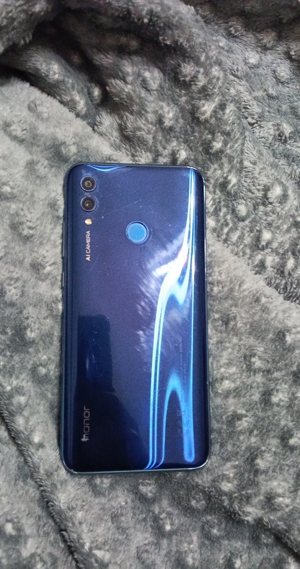 Parlak mavi renkte Honor Android telefon, çift arka kamera ve arkada parmak izi sensörü içerir.