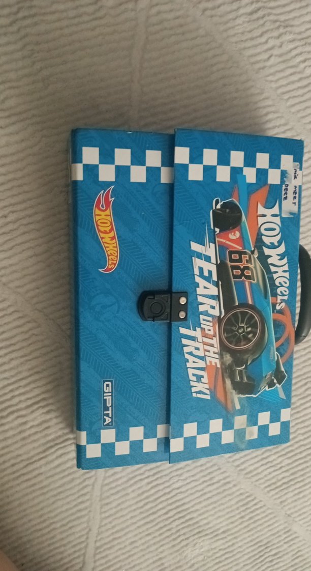 Parlak mavi renkte Hot Wheels oyuncak araba kutusu, yarış arabası desenli ve kilitli. Üzerinde TRACK ve GIPTA yazıları bulunur.