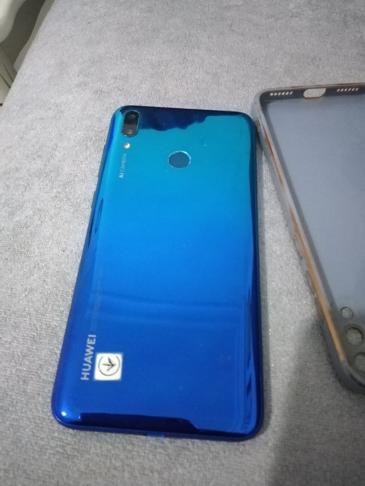 Parlak mavi renkte Huawei Android telefon, çift arka kamera ve parmak izi sensörü içerir. Telefonun arka yüzeyi yansıtıcı ve şıktır.