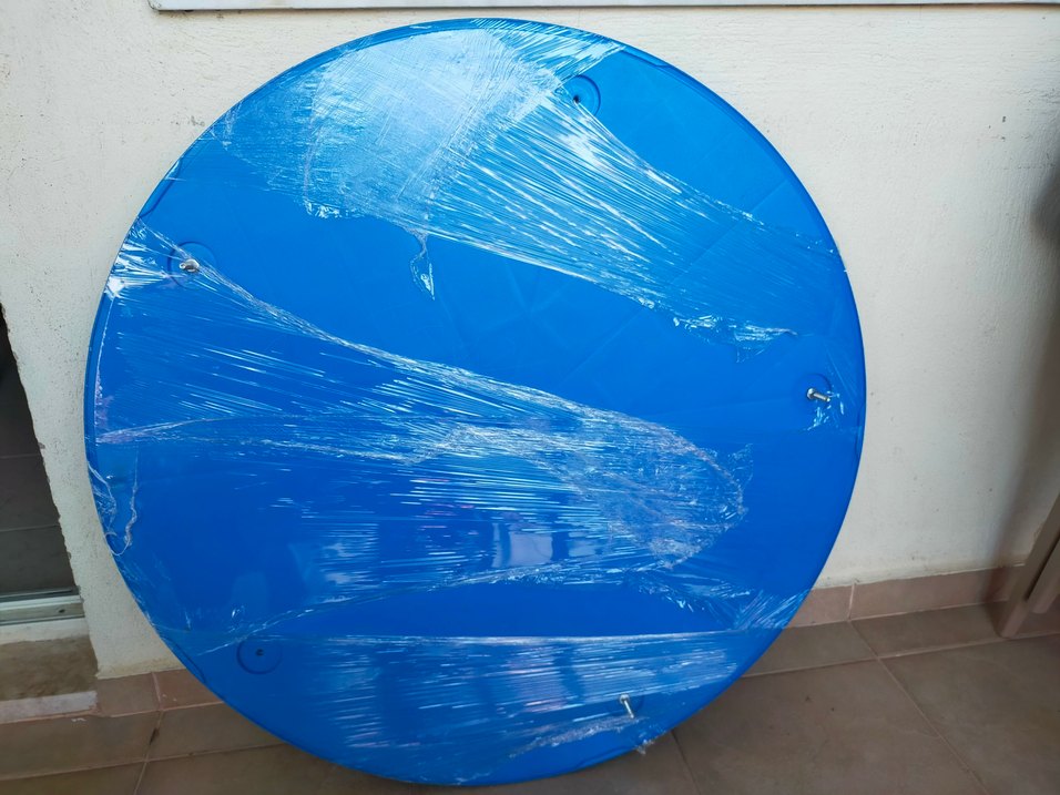 Parlak mavi renkte, desensiz yüzeye sahip, üzerinde kullanımdan dolayısıyla hafif çizikler mevcut