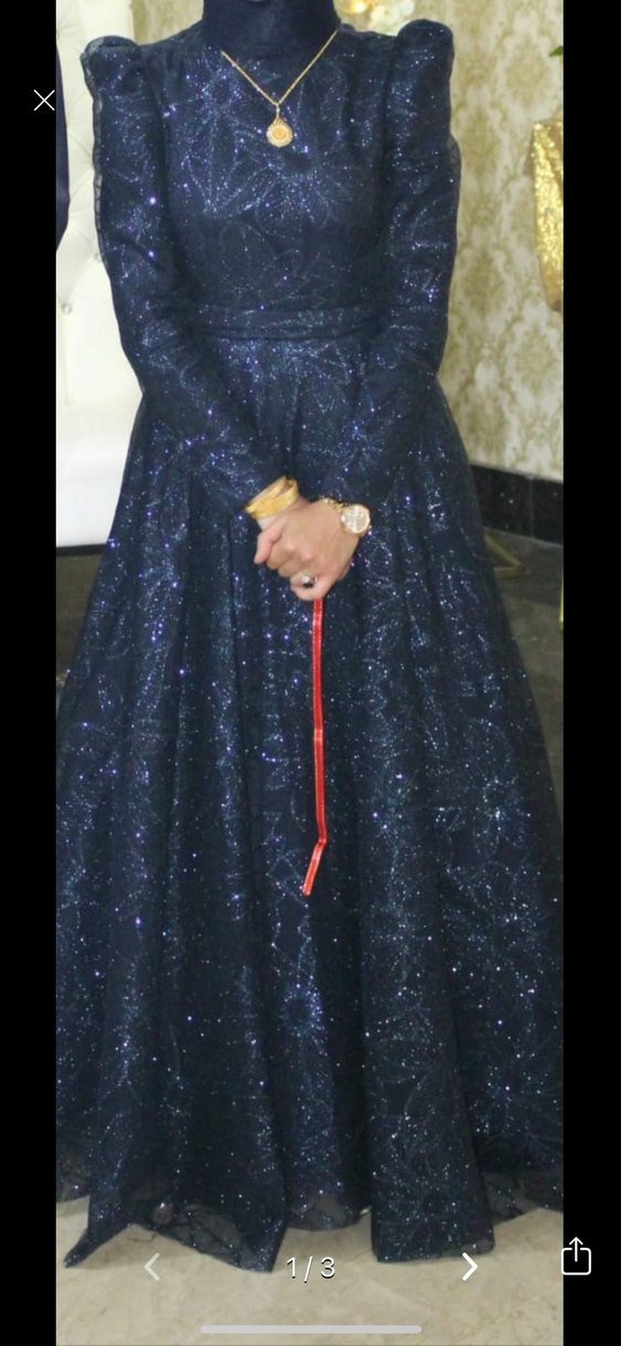 Parlak mavi işlemeli kumaştan, notlu yaka ve ince askılı, simli uzun abiye elbise. Düğünler için şık ve göz alıcı bir seçenek. ✨