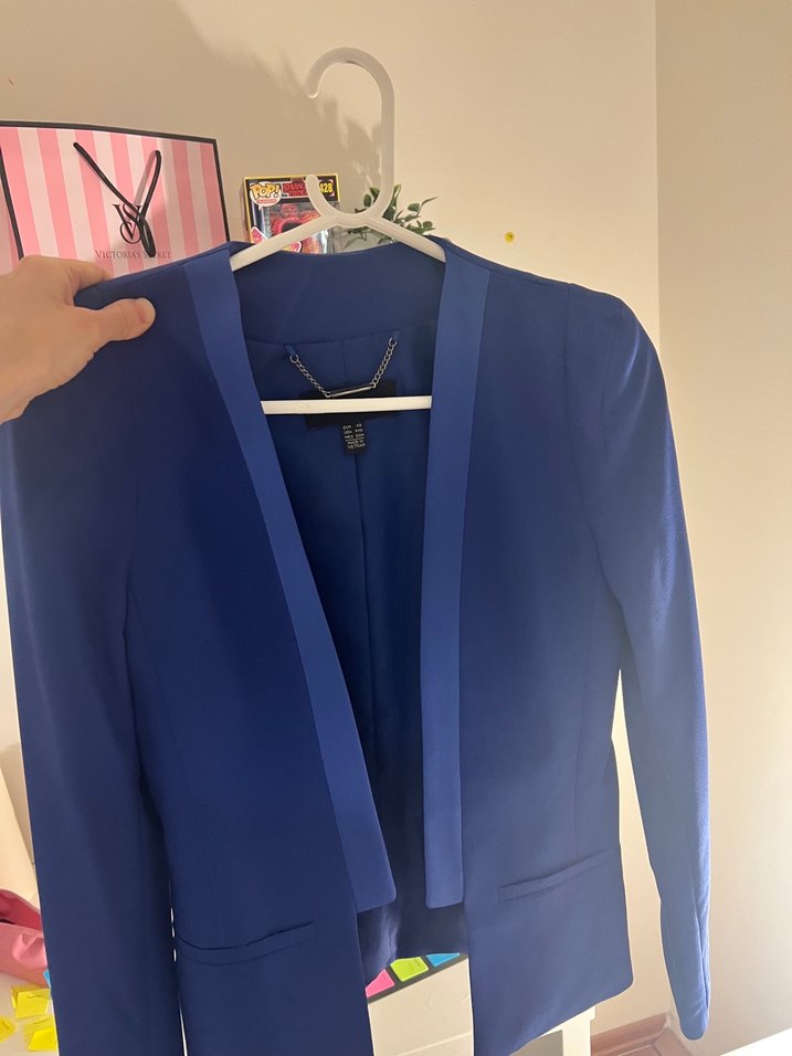 Bu dar kesim kadın blazer, parlak mavi renkte, ipeksi kumaştan, uzun kollu ve yakası kesikli. Kemer detayıyla ofis kullanımı için uygundur.
