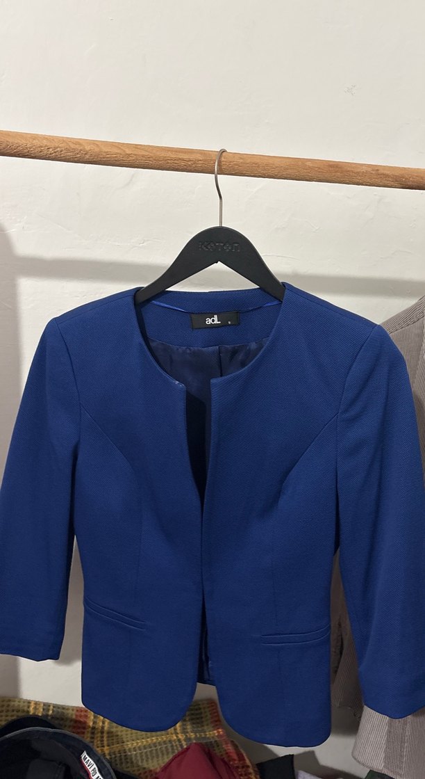 Parlak mavi renk, uzun kollu ve düğmeli ön kısmı ile kadın blazer ceket. İnce kesimi ve ipeksi dokusuyla modern ve şık bir görünüm sunar.