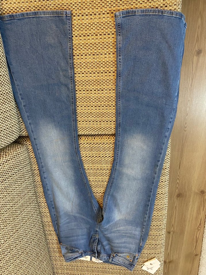 Parlak görünüme sahip, bileklerinde tokalı detaylar bulunan mavi kadın denim midi kot pantolon, günlük kullanıma uygun bohem tarz sunar.