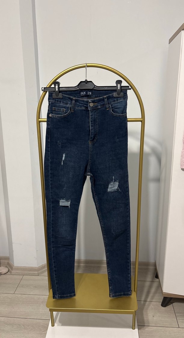 Parlak görünümlü, baskılı desenli ve tokalı detaylı mavi kadın denim pantolon, günlük sokak stiline uygundur.