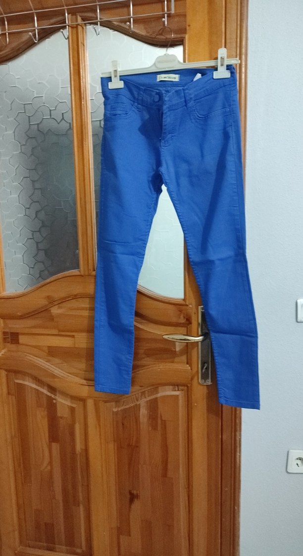 Parlak mavi renkte, kemerli bel ve regular fit kadın denim pantolon. Günlük sokak stili için uygundur.
