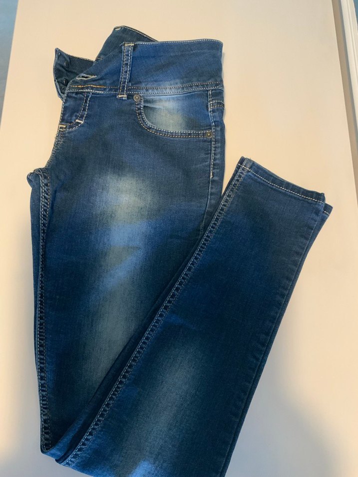 Parlak mavi renkte, normal boyda, dar kesim kadın denim pantolon. Günlük sokak stiline uygun, zahmetsiz şıklık sunar.