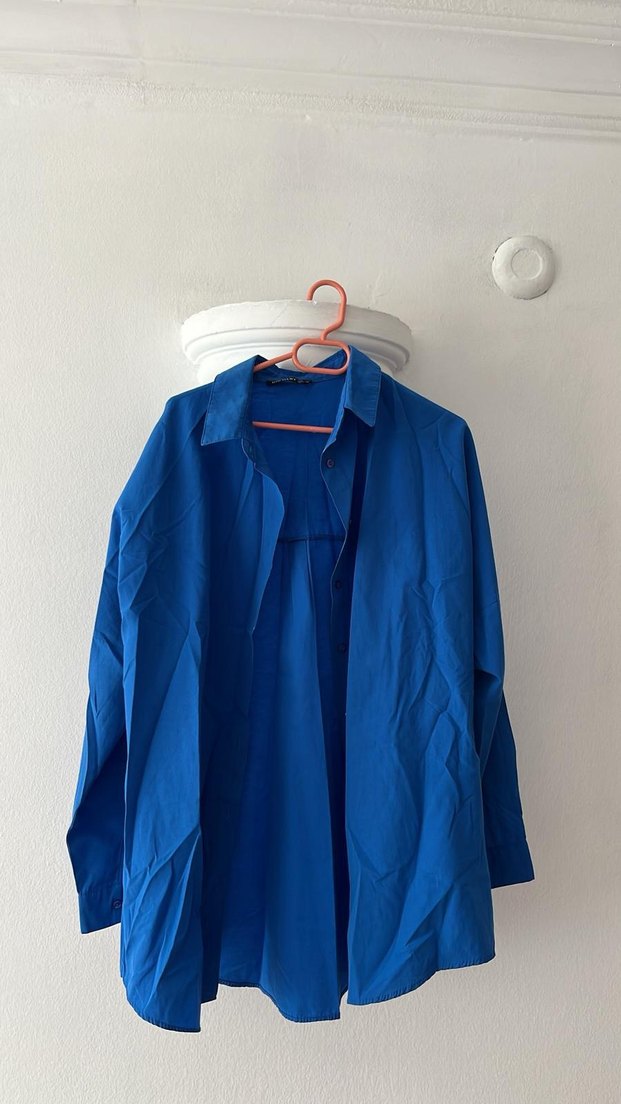 Parlak mavi renkte, uzun kollu ve klasik yakalı kadın gömleği. Canlı ve net bir görünüme sahiptir.