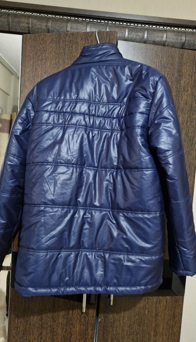 Parlak mavi renkte, çıtmalı yakalı ve uzun kollu erkek kışlık cekettir. Sentetik kumaştan, midi boyda, günlük sokak stili için uygundur. bi iki defa kullnildi .eni 55 biy 75cm