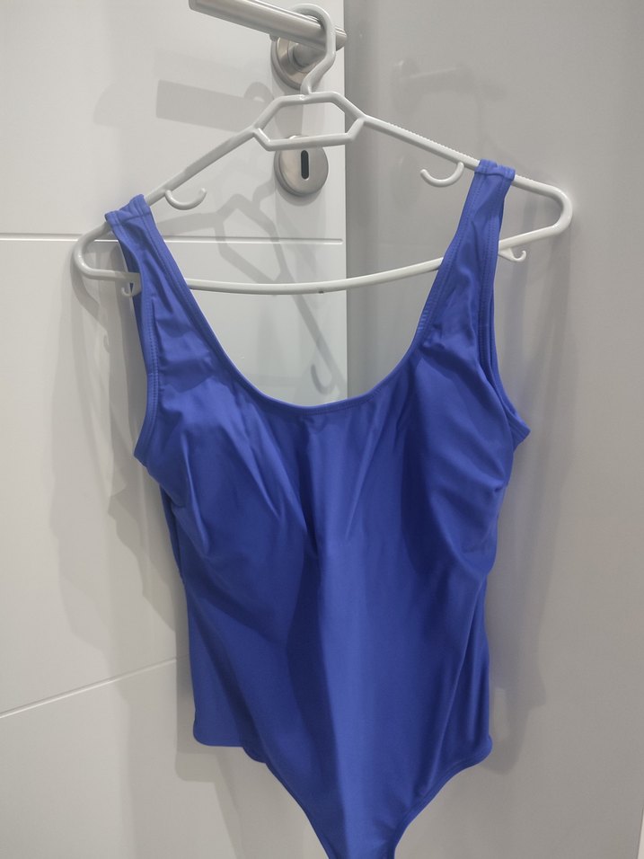 Parlak mavi, kolsuz ve vücuda oturan bu mayo cesur ve zahmetsiz şıklık sunar, plaj ve sokak modası için uygundur.