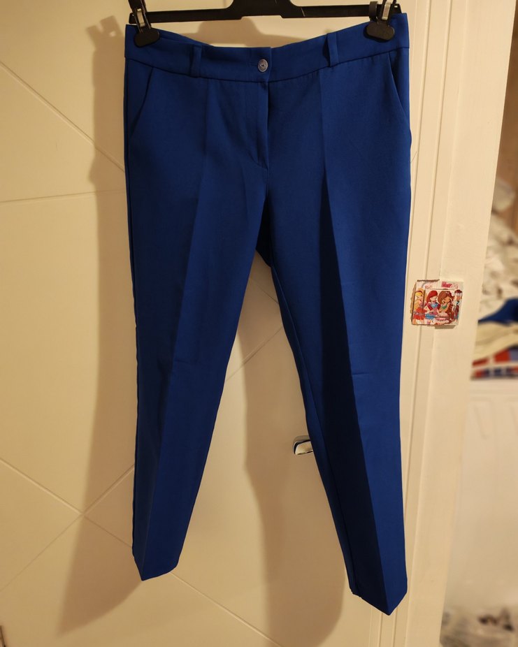 Parlak mavi renkte, kemerli, normal boy midi kadın kumaş pantolon. Ofis ve günlük şık kombinlere uygundur.