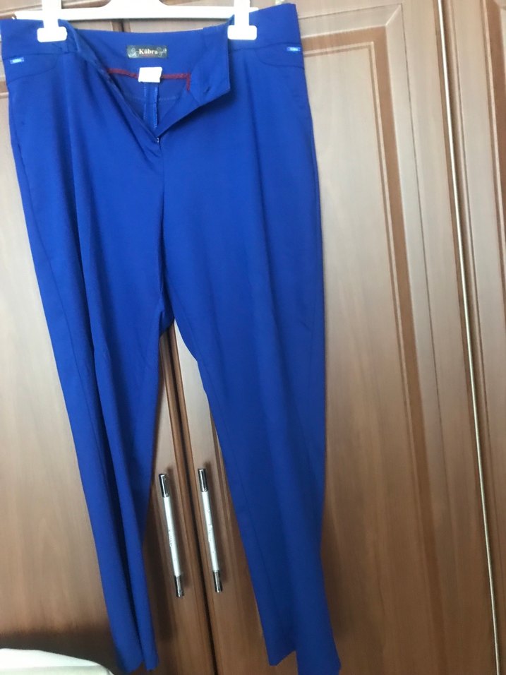 Parlak mavi renkte, dar kesim ve midi boy kadın kumaş pantolon. Yumuşak sentetik kumaştan, günlük kullanım için rahat ve şık bir seçenek.