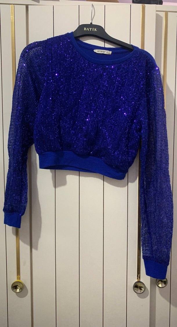 Parlak mavi renkli, uzun kollu, yuvarlak yaka ve mini kesim kadın trikosudur. Sentetik kumaştan üretilmiş, sim ve nakış detaylarıyla süslenmiştir. ✨