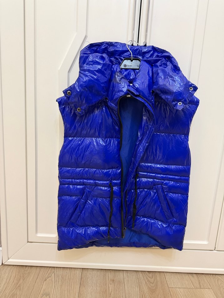 Parlak mavi renkte, fermuarlı ve yüksek yakalı, normal midi boyda, fitted kesim şişme kadın yelek. Streetwear stiline uygundur.