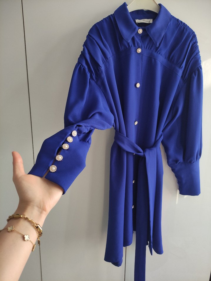 Parlak mavi renkte, uzun kollu ve bol kesim kadın elbisesi, manşette inci düğmeler ve belde kuşak bulunur. Paris sokak modasını yansıtır. zara değildir
