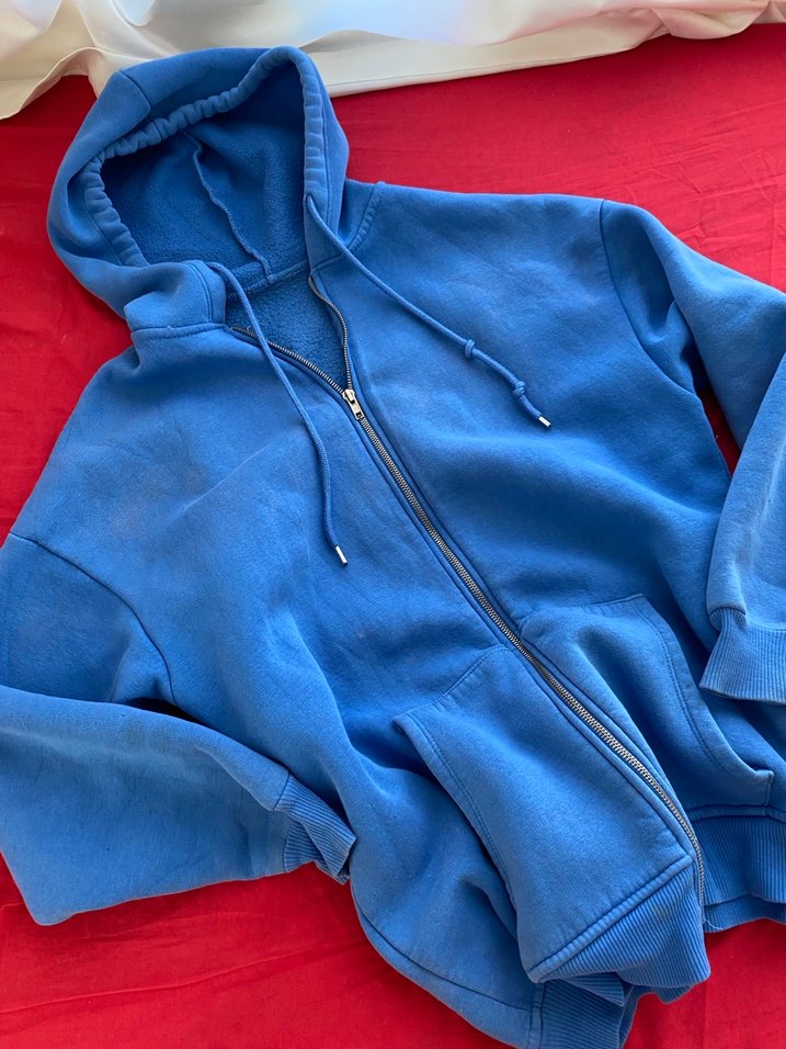 Parlak mavi renkte, kapüşonlu ve fermuarlı, bol kesim, yumuşak ve sıcak kumaştan sweatshirt. Uzun kollu ve normal boyda, günlük kullanım için uygun.