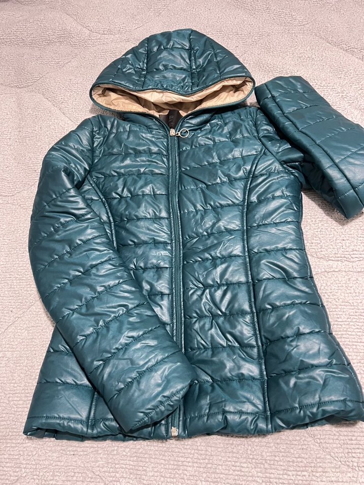 Parlak mavi sentetik kumaştan, fermuarlı ve kapüşonlu dar kesim kadın mont. Uzun kollu, rahat ve sokak stilinde, günlük kullanıma uygun midi uzunlukta.