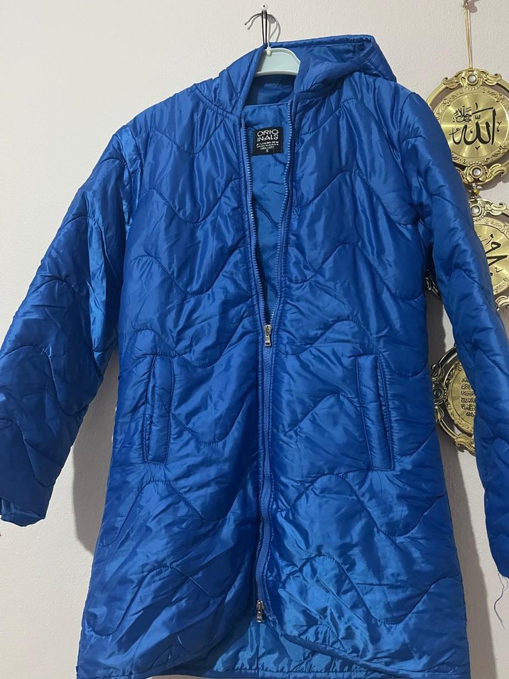 Parlak Mavi Kapüşonlu Kadın Mont
